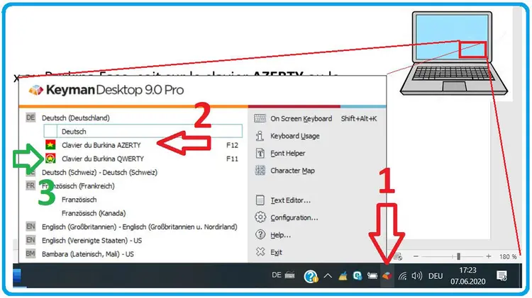 Lorsque vous avez activé le programme «Keyman», il y aura un petit symbole orange - rouge - bleu en bas de votre écran. Cliquez dessus pour choisir quel «keyman» votre clavier nécessite pour écrire ces caractères spéciaux :
